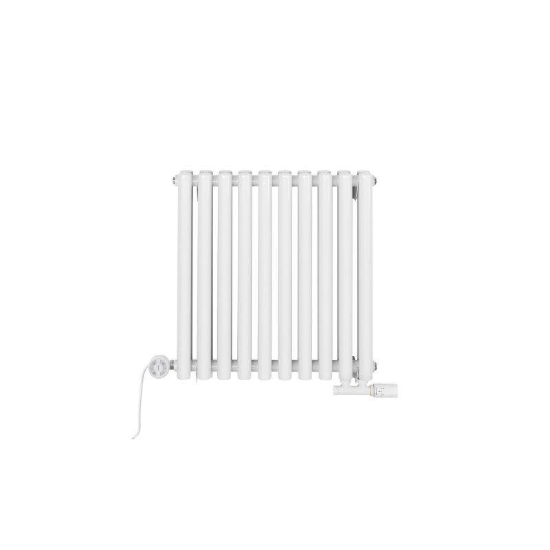 Grzejnik dekoracyjny hybrydowy Gilda 600x590 biały MOA to elegancki model łączący funkcję ogrzewania wodnego i elektrycznego. Wyposażony w podwójny rząd pionowych, okrągłych rur, zapewnia wysoką moc grzewczą i równomierne rozprowadzanie ciepła. Klasyczny design w jasnej bieli doskonale komponuje się z wnętrzami w stylu skandynawskim i japandi. Grzałka elektryczna MOA dzięki łatwemu interfejsowi umożliwia komfortowe sterowanie temperaturą niezależnie od instalacji centralnego ogrzewania, a zawór Multiflow INVEST zapewnia najwyższą funkcjonalność i przyjemność użytkowania.