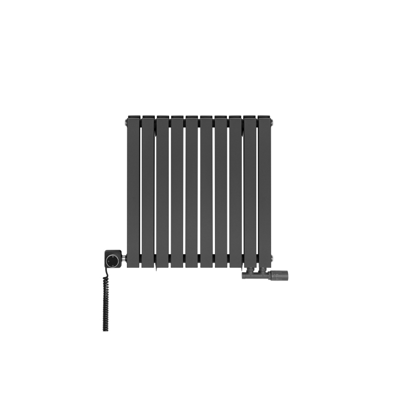 Grzejnik dekoracyjny hybrydowy Judy 600x590 grafit MOA to nowoczesny model łączący ogrzewanie wodne i elektryczne. Wyposażony w podwójny rząd pionowych, płaskich paneli w kolorze eleganckiego grafitu, gwarantuje wysoką moc grzewczą i szybkie oddawanie ciepła. Nowoczesny design sprawia, że doskonale komponuje się z wnętrzami loftowymi i industrialnymi. Grzałka elektryczna MOA z funkcją Wi-Fi i intuicyjnym sterowaniem umożliwia wygodne kontrolowanie temperatury niezależnie od instalacji CO, a zawór Multiflow INVEST zapewnia pełną funkcjonalność i komfort codziennego użytkowania.