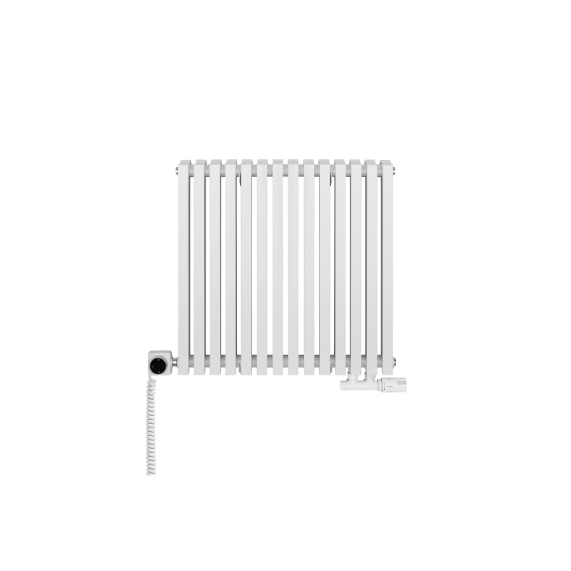 Grzejnik dekoracyjny hybrydowy Nomad 600x630 biały MOA to nowoczesne rozwiązanie łączące ogrzewanie wodne i elektryczne. Wyposażony w dwa rzędy pionowych paneli o prostokątnym przekroju zapewnia wysoką wydajność grzewczą oraz równomierne rozprowadzanie ciepła. Klasyczny design w subtelnej bieli doskonale komponuje się z wnętrzami jasnymi i w stylu skandynawskim. Grzałka elektryczna MOA dzięki łatwemu interfejsowi i połączeniu z Wi-Fi umożliwia komfortowe sterowanie temperaturą niezależnie od instalacji centralnego ogrzewania, a zawór Multiflow Invest sprawia, że korzystanie z grzejnika jest czystą przyjemnością!