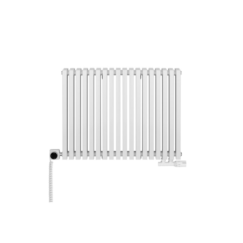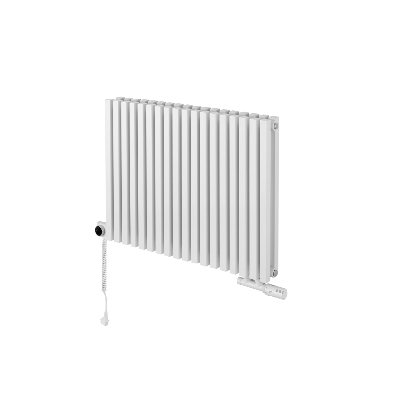 Grzejnik dekoracyjny hybrydowy Nomad 600x810 biały MOA to nowoczesne rozwiązanie łączące ogrzewanie wodne i elektryczne. Wyposażony w dwa rzędy pionowych paneli o prostokątnym przekroju zapewnia wysoką wydajność grzewczą oraz równomierne rozprowadzanie ciepła. Klasyczny design w subtelnej bieli doskonale komponuje się z wnętrzami jasnymi i w stylu skandynawskim. Grzałka elektryczna MOA dzięki łatwemu interfejsowi i połączeniu z Wi-Fi umożliwia komfortowe sterowanie temperaturą niezależnie od instalacji centralnego ogrzewania, a zawór Multiflow Invest sprawia, że korzystanie z grzejnika jest czystą przyjemnością!
