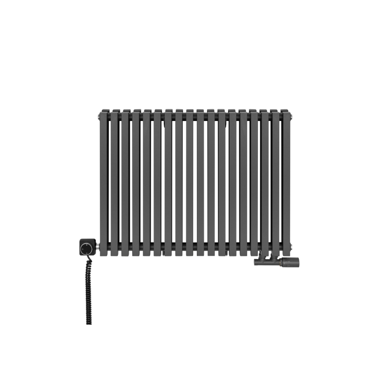 Grzejnik dekoracyjny hybrydowy Nomad 600x810 grafit MOA to nowoczesne rozwiązanie łączące ogrzewanie wodne i elektryczne. Wyposażony w dwa rzędy pionowych paneli o prostokątnym przekroju zapewnia wysoką wydajność grzewczą oraz równomierne rozprowadzanie ciepła. Nowoczesny design w stylowym graficie doskonale komponuje się z wnętrzami loftowymi i industrialnymi. Grzałka elektryczna MOA dzięki łatwemu interfejsowi i połączeniu z Wi-Fi umożliwia komfortowe sterowanie temperaturą niezależnie od instalacji centralnego ogrzewania, a zawór Multiflow Invest sprawia, że korzystanie z grzejnika jest czystą przyjemnością!