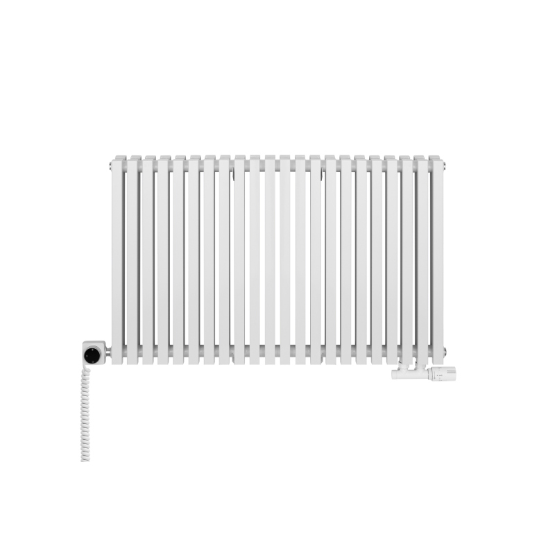 Grzejnik dekoracyjny hybrydowy Nomad 600x990 biały MOA to nowoczesne rozwiązanie łączące ogrzewanie wodne i elektryczne. Wyposażony w dwa rzędy pionowych paneli o prostokątnym przekroju zapewnia wysoką wydajność grzewczą oraz równomierne rozprowadzanie ciepła. Klasyczny design w subtelnej bieli doskonale komponuje się z wnętrzami jasnymi i w stylu skandynawskim. Grzałka elektryczna MOA dzięki łatwemu interfejsowi i połączeniu z Wi-Fi umożliwia komfortowe sterowanie temperaturą niezależnie od instalacji centralnego ogrzewania, a zawór Multiflow Invest sprawia, że korzystanie z grzejnika jest czystą przyjemnością!
