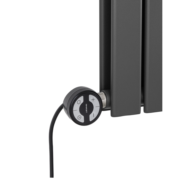 Grzejnik dekoracyjny hybrydowy Wanted 600x612 grafit MOA wyróżnia się nowoczesnym charakterem dzięki szerokim, prostokątnym, płaskim panelom ułożonym w dwóch rzędach. Elegancki grafit podkreśla jego solidną formę i sprawia, że świetnie pasuje do wnętrz industrialnych, wabi-sabi i chalet. Hybrydowa konstrukcja umożliwia pracę zarówno w instalacji wodnej, jak i w trybie elektrycznym, grzałka MOA z prostym w użyciu interfejsem zapewnia wygodne sterowanie temperaturą o każdej porze roku, a zawór termostatyczny Multiflow INVEST gwarantuje pełną funkcjonalność i komfort codziennego użytkowania