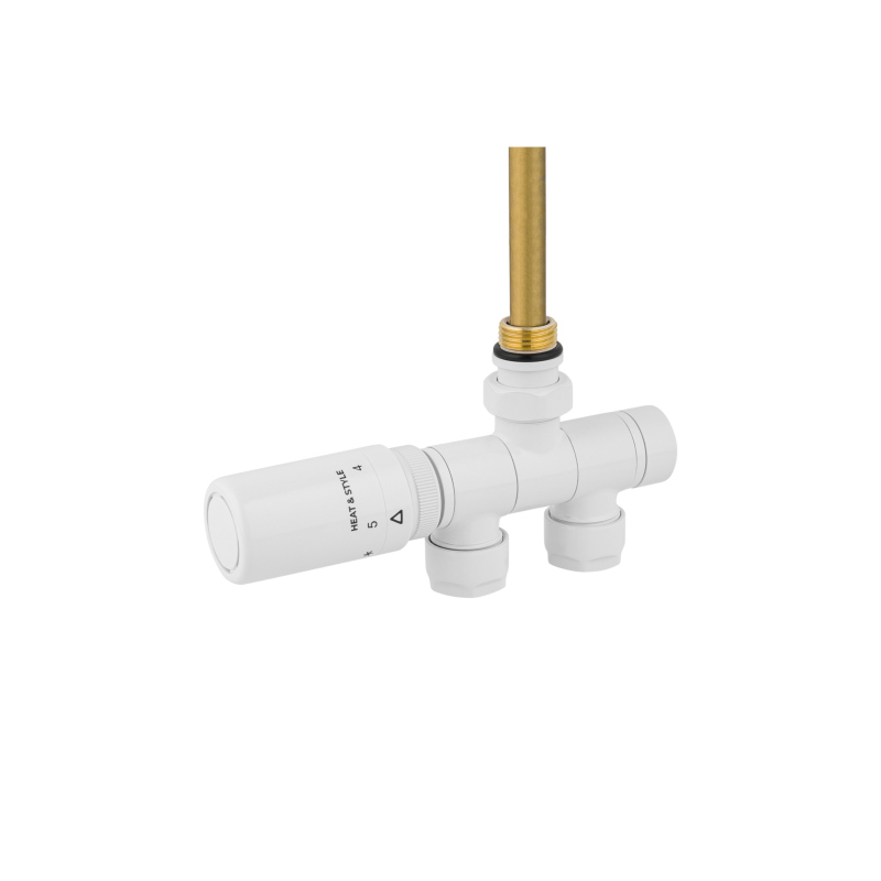 Zawór termostatyczny z przyłączem jednootworowym, uniwersalny (kątowy lewy, prawy, prosty). Kolor biały.