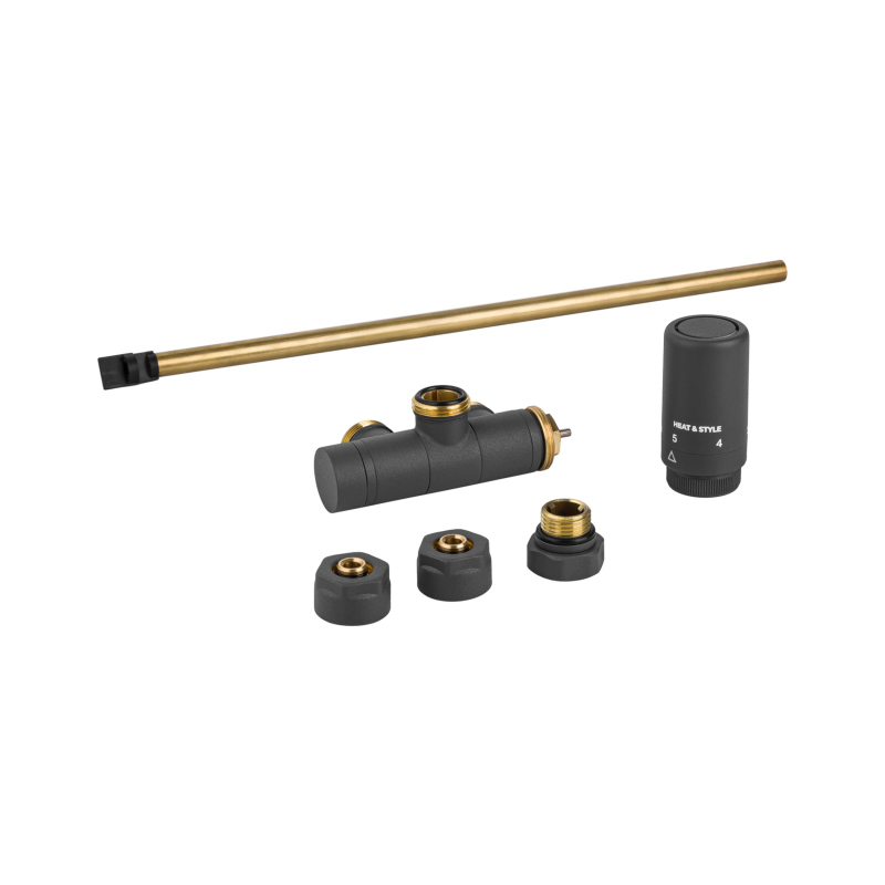 Zawór termostatyczny z przyłączem jednootworowym, uniwersalny (kątowy lewy, prawy, prosty). Kolor grafit.
