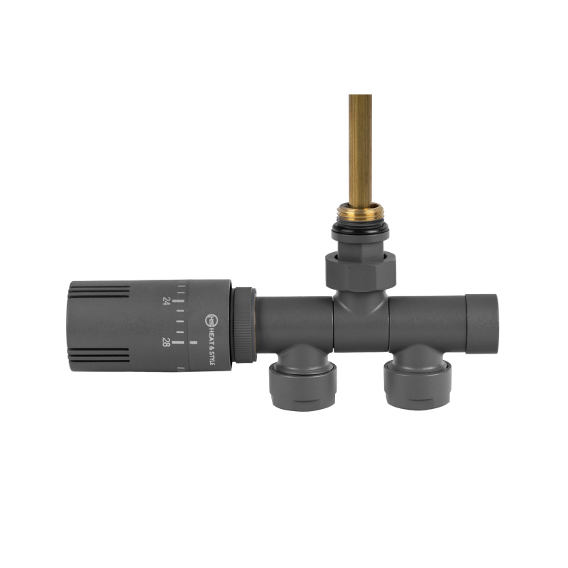 Zawór termostatyczny z przyłączem jednootworowym, uniwersalny (kątowy lewy, prawy, prosty). Posiada głowicę INVEST wskazującą dokładną temperaturę zamiast skali 1-5. Kolor grafit.