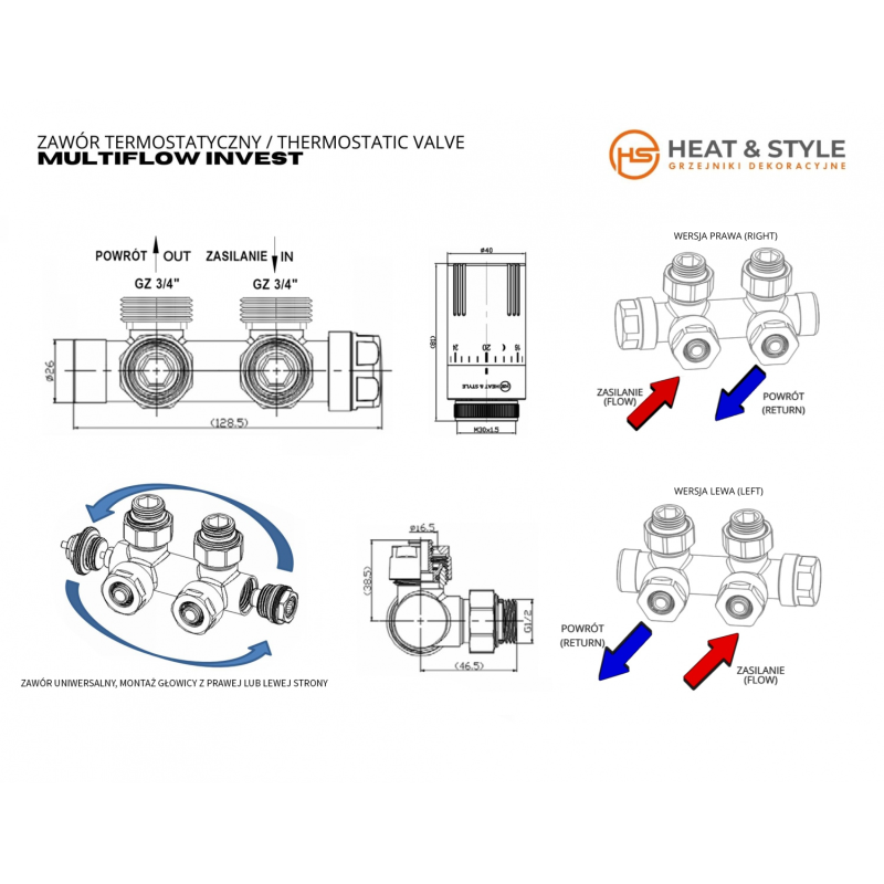 Zawartość opakowaniaZawór termostatyczny zespolony, głowica termostatyczna, nyple redukcyjne. Dodatkowo do zaworu należy dokupić odpowiednie złączki.