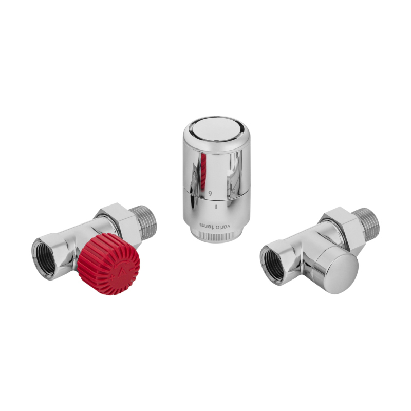 Zestaw termostatyczny odpowiednie do przyłączania grzejników łazienkowych i pokojowych z podłączeniem bocznym. Figura prosty, kolor chrom. W komplecie głowica termostatyczna z serii Tucan.